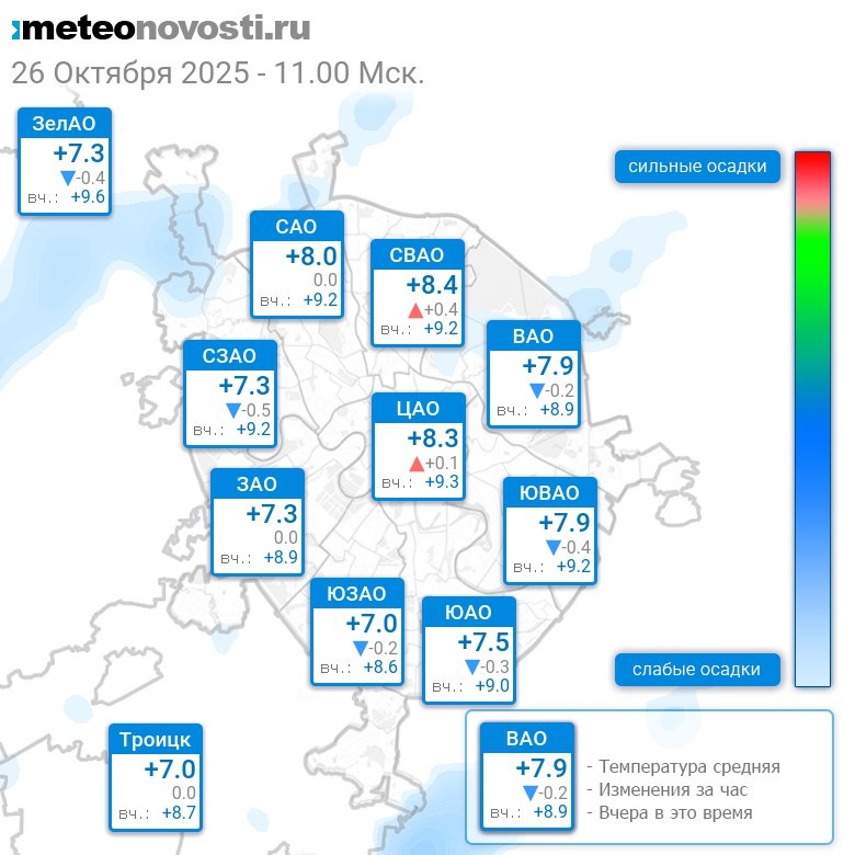 В 11:00 в Москве было от +6.5°C до +8.8°C, средняя температура +7.8°C #погода #Москва #осень #температура #26октября #воскресенье Перейти на сайт Прогноз погоды на 14 дней