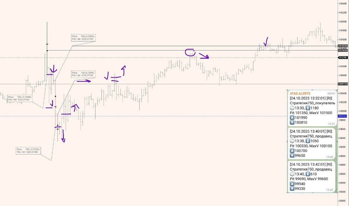 📈 Отработка стратегии 750 В пятницу было три сигнала по стратегии 750. При работе через антиакцепт мы получили три входа: 1️⃣ Первое усилие — вход на антиакцепте, прибыль +750 пунктов. 2️⃣ Второе усилие — вход на акцепте, затем переворот, итог –300 пунктов. 3️⃣ Третье усилие — вход на антиакцепте, прибыль +750 пунктов. 📊 Общий результат за пятницу: 750 – 300 + 750 = 1200 пунктов. 💰 При работе 10 контрактами это составляет 19 500 руб. Не ИИР