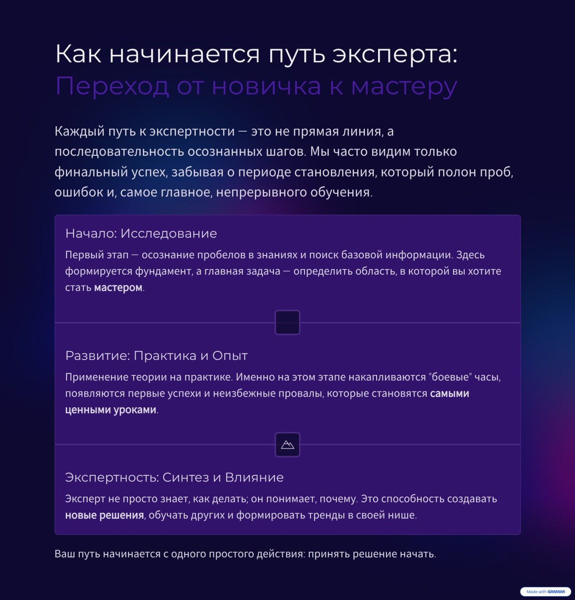 “Как начинается путь эксперта” Сегодня хочу поговорить с вами не про Telegram и не про упаковку, а про жизнь. Про то, с чего всё начинается. Потому что за каждым проектом, за каждым продуктом, стоит человек — со своей историей, ошибками и решениями. И то, чем я делюсь, — это не теория, это мой путь. Пройденный. Своими шагами. Когда-то я работала на фабрике. Жила, как все — работа, зарплата, планы. Пока однажды всё не рухнуло. Перестройка, задержки, “товар вместо денег”. И тот момент, когда надо отправлять ребёнка в школу, а денег даже на тетрадки нет. Мы выживали, как могли — пекли хлеб, выращивали овощи. Но это был первый толчок: нужно что-то менять. Потом был переезд в село, хозяйство, новые заботы. А потом — новая реальность: родители, кредиты, возраст, и понимание, что “найм” не спасает. Работаешь — а жить некогда. И тогда я решила: иду в интернет. Пробовала себя в сетевом. Ошибалась, училась, вкладывалась. Было тяжело, но именно там я получила первый опыт — и поняла, что хоч