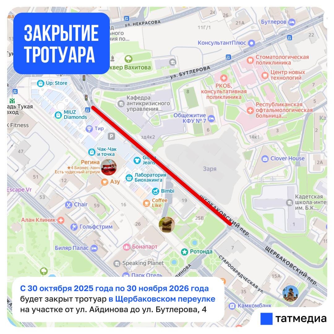 🚧🚶♂️В Казани временно закроют тротуар в Щербаковском переулке