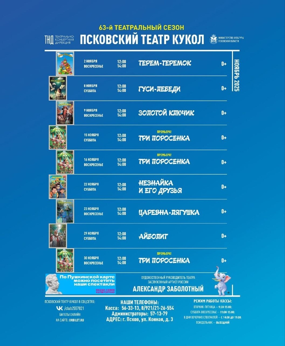 Афиша на ноябрь псковского театра кукол 🎭 🏠 «Терем-теремок» — известная сказка о дружбе и взаимопомощи. 🦢 «Гуси-лебеди» — трогательная история о храбрости и любви к семье. 🗝 «Золотой ключик» — волшебные приключения Буратино и его друзей. 🐷 «Три поросенка» — поучительная сказка о труде и умении строить. 🔷 «Незнайка и его друзья» — смешные приключения Незнайки, где добро и дружба всегда побеждают. 🐸 «Царевна-лягушка» — романтическая история о любви и чудесных превращениях. 💊 «Айболит» — рассказ о самоотверженной работе врача и родительской любви к больным детям. Каждый спектакль увлекает детей и преподносит им важные жизненные уроки. 🎟 Билеты в кассе театра и онлайн: https://clck.ru/aeCCy Оставайтесь с нами #НашаПсковскаяобласть