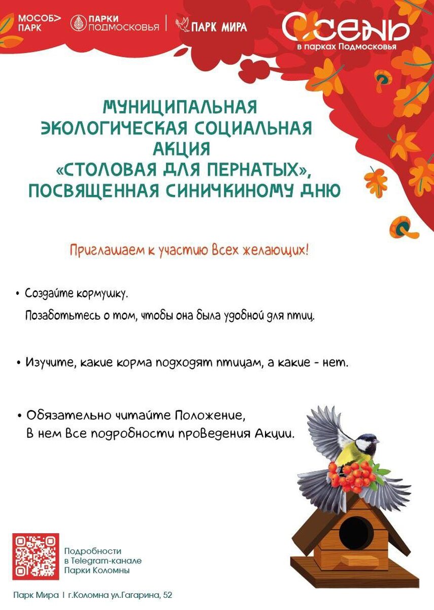 🐧 12 ноября мы празднуем Синичкин день. Праздник символизирует единство человека и природы, и призывает к защите пернатых, которым зимой особенно трудно. ✨ Всех неравнодушных приглашаем принять участие в муниципальной экологической социальной акции «Столовая для пернатых», посвященной Синичкиному дню! ✔Шаг 1. ️ Заранее изготовьте кормушки. ✔Шаг 2. Ваши поделки будем ждать 10 и 11 ноября * с 14.30 до 17.00 – Парк Мира (ул.Гагарина, 52). Приём у главной сцены. * с 10.00 до 19.00 – ДК «Текстильщик» - главный вход (Озёры, ул. Ленина, д.20) ✔Шаг 3. Не забывайте пополнять кормушки кормом (изучите, что любит та или иная птичка, не забывайте, что корм должен быть полезен) Забота о птицах – это забота обо всей окружающей среде и будущем каждого человека.