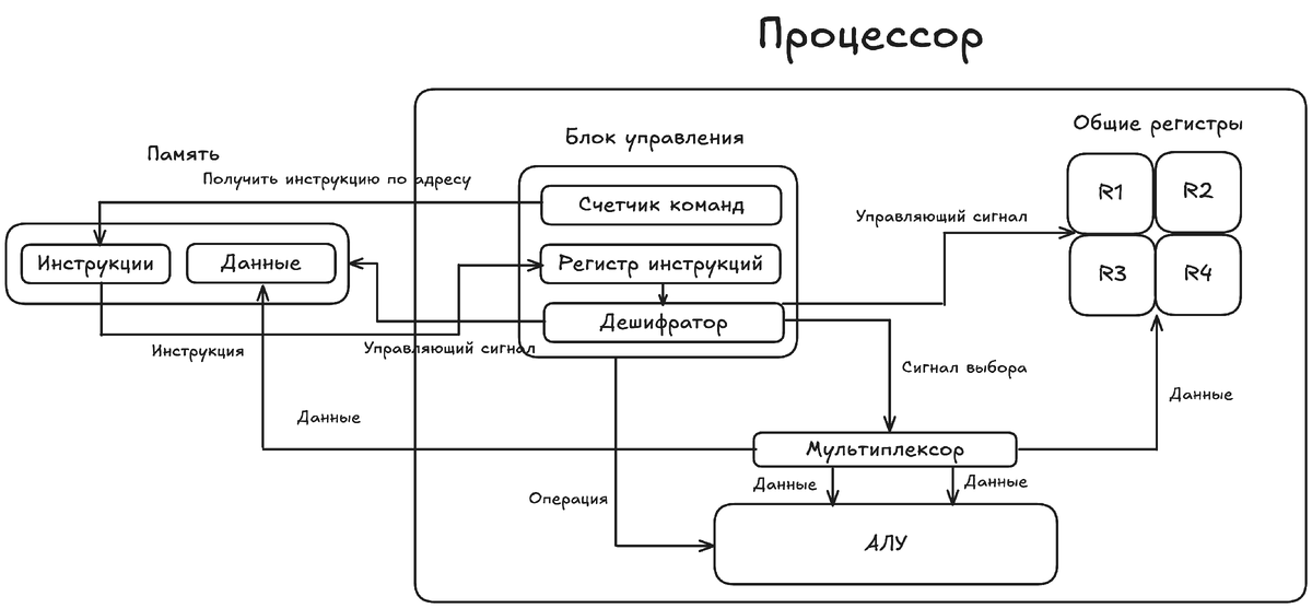 - Дешифратор берёт инструкцию из Регистра инструкций и создаёт управляющие сигналы: какой Общий регистр читать, какой Общий регистр записать, какую операцию выполнить в АЛУ, какой вход выбрать у Мультиплексора, нужно ли обратиться к памяти за данными.
