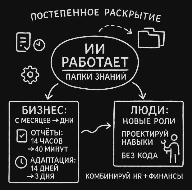 ИИ наконец перестаёт быть болтливым. Начинает работать. Любой, кто пытался внедрить ИИ в бизнес, знает: ассистенты умные, но бесполезные. Они не знают, где лежат твои договора, как согласовывать счета и по какой форме писать отчёт. Каждый раз приходится учить с нуля. Anthropic решила закрыть эту дыру - выкатили Skills for Claude. Теперь ИИ получает доступ к папкам знаний: инструкции, шаблоны, код, регламенты, бренд-гайды - всё внутри. Claude сам выбирает, что ему открыть и как использовать. Хочешь, чтобы он готовил квартальные отчёты по твоим шаблонам? Просто загружаешь Skill - и оно работает. Без кода, без интеграторов, без программистов. Anthropic называет это progressive disclosure: сначала Claude видит список доступных навыков, потом сам решает, какие активировать. Можно комбинировать несколько - например, HR и финансы в одном сценарии. Итог - Ai превращается не в помощника, а в сотрудника, который знает внутренние процедуры лучше, чем сами сотрудники. К чему всё идет? Для б