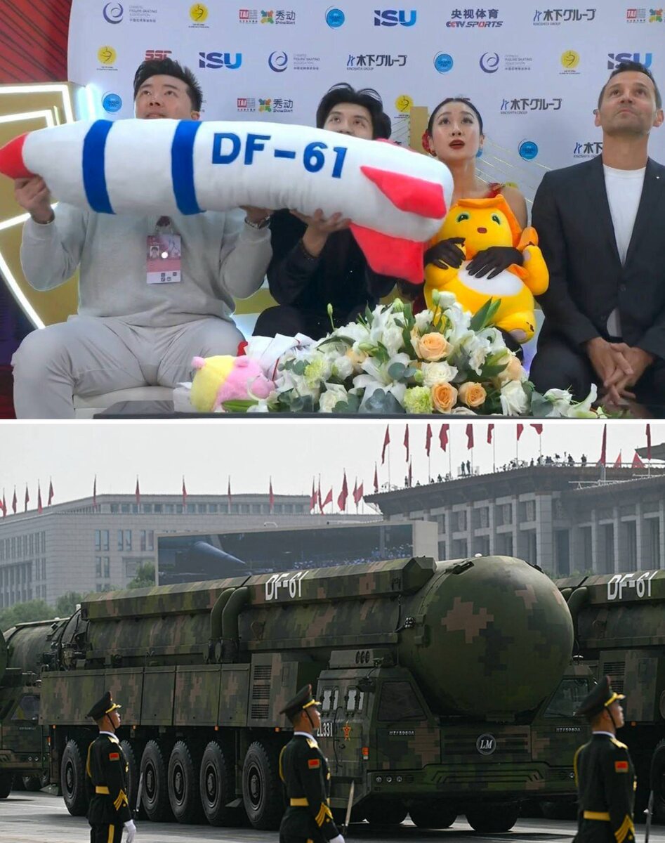 В руках спортсменов была «ракета» под названием DF-61 (китайская межконтинентальная баллистическая ракета наземного базирования). Отмечается, что информации о снаряде не так много, поскольку он является новейшим.