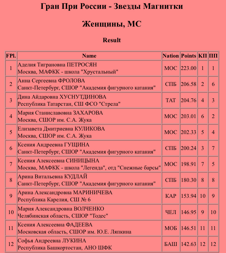 У одиночниц завершился первый этап Гран-при России. На этих соревнованиях судейство было особенно строгим. Судьи находили и отмечали малейшие неточности. Алексей Ягудин прямо негодовал, что ничего не идёт в пользу спортсмена, и даже сказал, что это деградация фигурного катания. Удивило, что комментаторы будто бы не разбираются в правилах. Например, после проката Арины Мариничевой Михаил Коляда сказал, что из-за повтора тройного флипа вне каскада ей обнулили другой каскад. Это не так. В процессе выставления оценок во время проката каскад может уйти под звезду, но это техническая ошибка, и потом уже по завершению выступления, в ручном режиме всё исправляют. Невероятной красоты программа под «Времена года». Изящно. 2A+3T, 2A, 3Lz+1Eu+3S, 3F, 3F (повтор без каскада), 3Lz+2T, 3Lo Обидно за падение на втором тройном флипе, а самое грустное, что был повтор прыжка, и Арина получила за флип чуть больше балла и вдобавок балл штрафа за падение. Бывает и так. Несмотря на ошибку, я насладилась е
