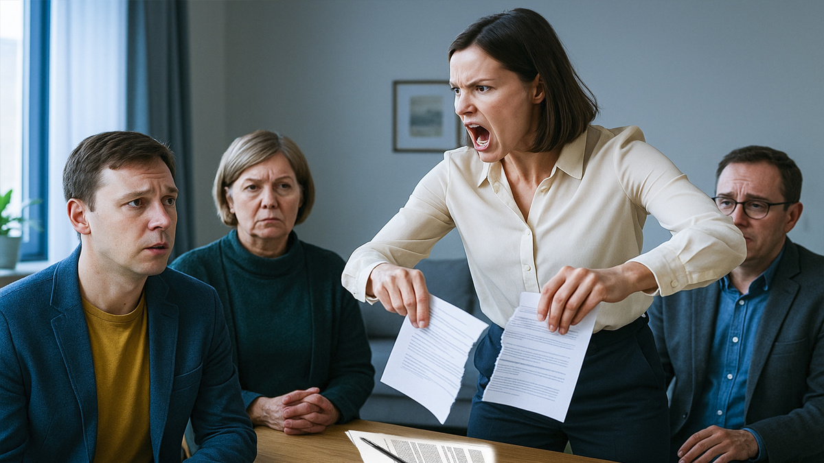 Ксения схватила стопку документов со стола. Кредитный договор, договор купли-продажи, справки, выписки. Всё в руках. Женщина посмотрела на мужа, на свекровь, на нотариуса. Потом разорвала документы пополам.