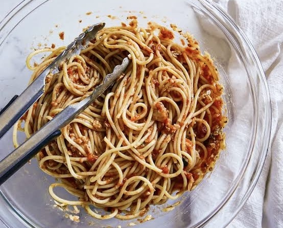 - Откидываем готовые спагетти на дуршлаг, перекладываем в сковороду с соусом.