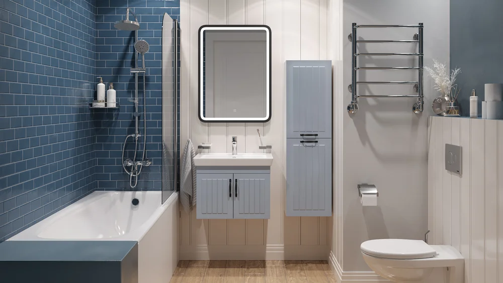 На плитку и клей уйдёт около 30–40% бюджета. Остальное — сантехника, мебель, электрика, свет, работы.