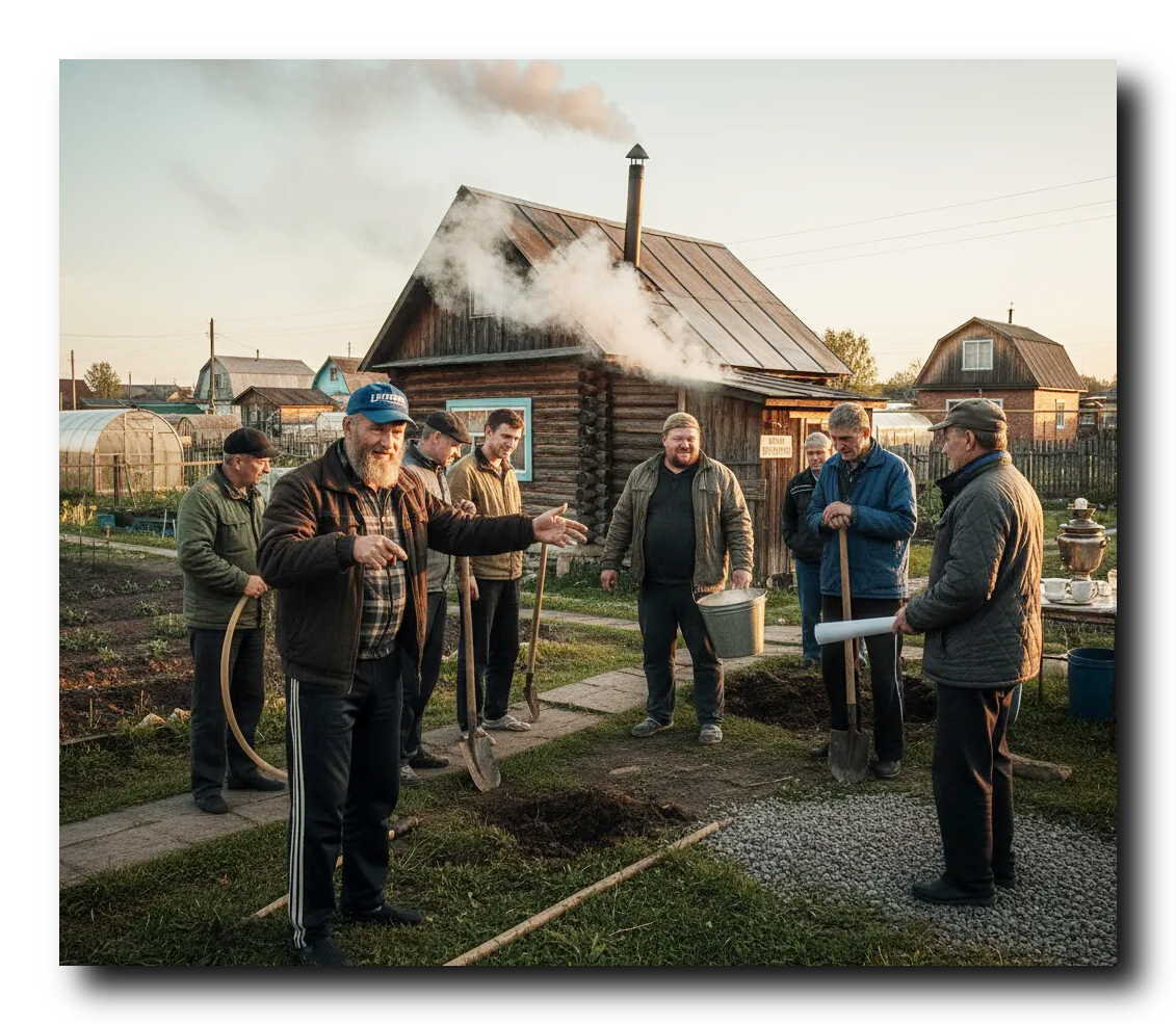 Итак, начну, как полагается, с предыстории. Живем мы в СНТ «Локомотив». Название обязывает — все мы тут, так или иначе, «болеем» за общее дело: кто за огурцы, кто за розы, а кто и вправду за футбольный клуб. Я здесь уже лет двадцать, отстроился, обжился. Соседи вокруг разные подобрались. Вот Сергей Петрович, он же Петрович, он же просто Сосед-С-Банным-Вопросом — человек с размахом. Купил участок пару лет назад и сразу заявил: «Будет у меня баня! Не просто будка с тазиком, а царские хоромы!».