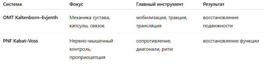 — концептуальная формула нейроортопедии XXI века OMT и PNF выросли из разных традиций — механической и нейрофизиологической, но сегодня они — два аспекта одной системы управления движением. 🧠 Вместе они создают замкнутую петлю восстановления: «структура — движение — контроль — функция — адаптация». 🔹 OMT — устраняет структурное ограничение: капсула, сустав, фасция.