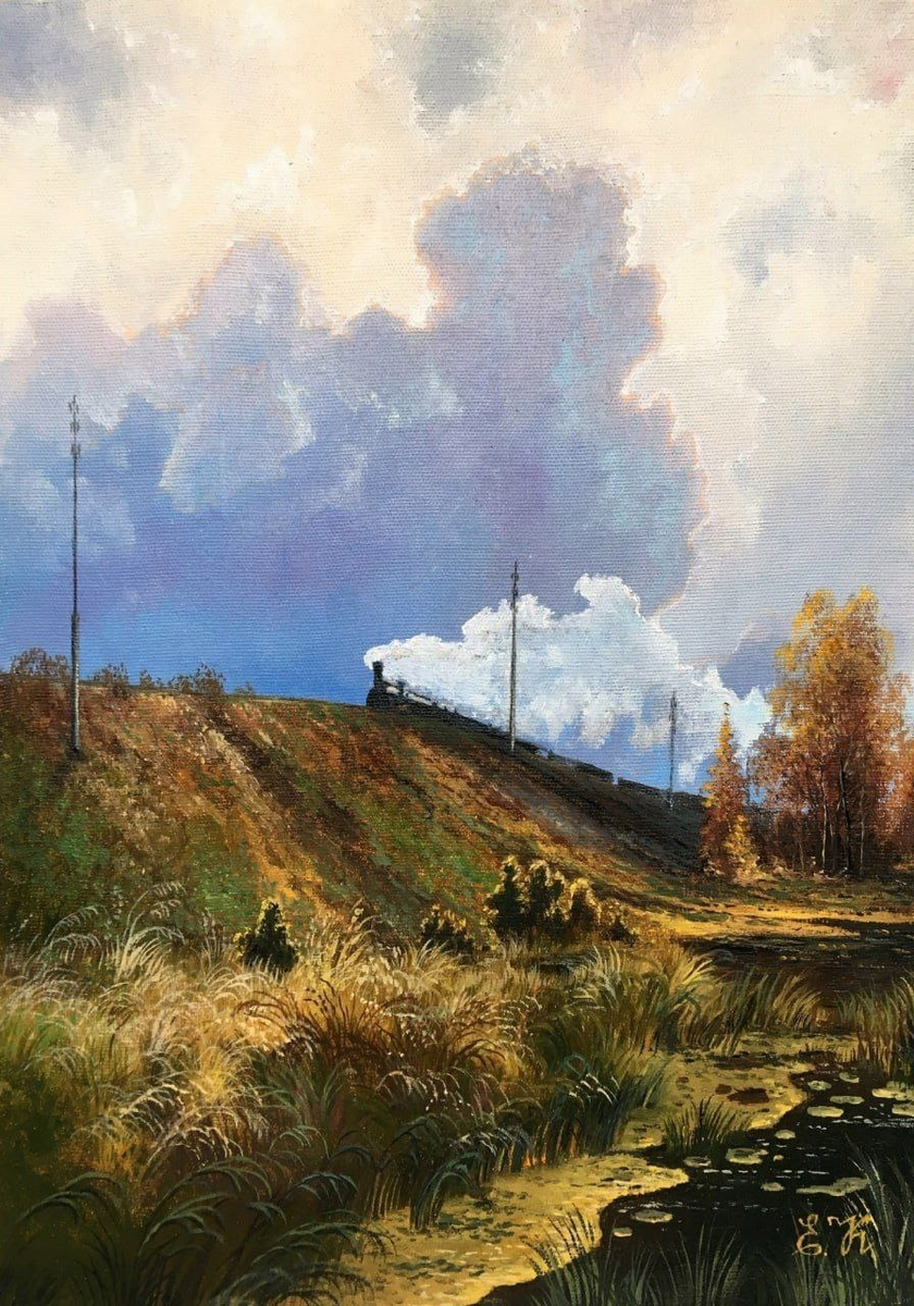 И вода в болоте темная, и само болото илом заросшее, и крутой склон насыпи с ржавыми проплешинами, и несколько темных березок в сторонке – все это как-то совсем неромантично выглядит... Но почему так весело смотреть на эту картину? Может оттого, что небо такое большое и светлое? И паровозик веселый и энергичный?