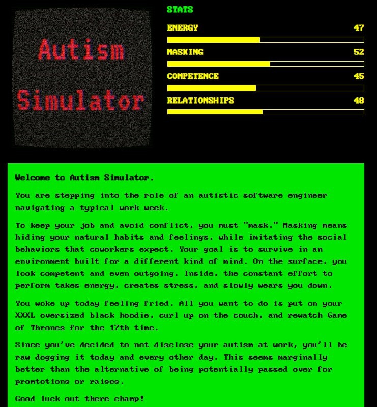 Наткнулся тут на любопытный проект — Autism Simulator. Это текстовый симулятор, где вы — аутичный разработчик, который просто пытается пережить очередную рабочую неделю. Ваша задача — балансировать статы: energy, masking, competence и relationships, чтобы не вылететь с работы и не словить нервный срыв. Ключевая механика — "маскировка". Это постоянное, изматывающее усилие, чтобы скрывать свои естественные реакции и имитировать "нормальное" поведение, которого от тебя ждут коллеги. Улыбнулся на созвоне, когда не хотел? Потратил energy и masking. Решил поработать в наушниках, чтобы сконцентрироваться? Потерял очки relationships. По сути, игра превращает невидимую ментальную нагрузку, с которой сталкиваются многие нейроотличные люди в IT, в понятную систему ресурсов. Автор сразу предупреждает: это симуляция опыта одного конкретного человека, а не репрезентация всех аутичных людей. Но, думаю, многие узнают в этом симуляторе частичку себя или той корпоративной дичи, через которую приходитс