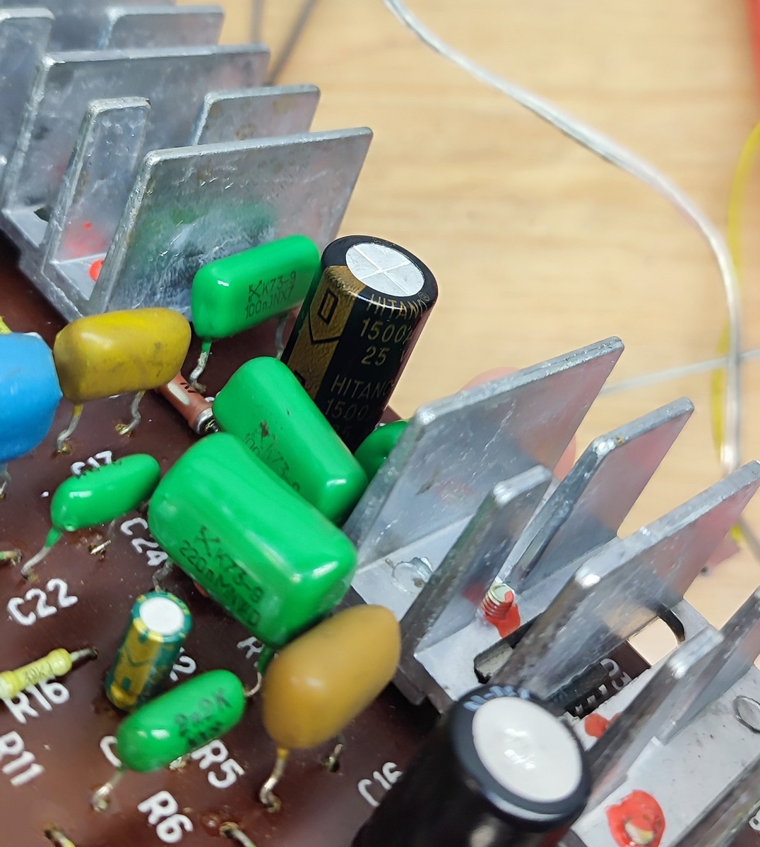 Затем занялся платами. Каждую вытаскивал, отмывал. Менял уставшие электролитические конденсаторы. Никаких изменений не вносил, кроме электролитического конденсатора С27 на плате УНЧ. Родной стоял на 220 мкФ (усох до 189 мкФ), а поставил на 1500 мкФ 25 вольт. Попадалось видео, где советуют заменить этот конденсатор. Он стоит по питанию и пропускает пульсации на большой громкости. Вроде бы правильно понял).