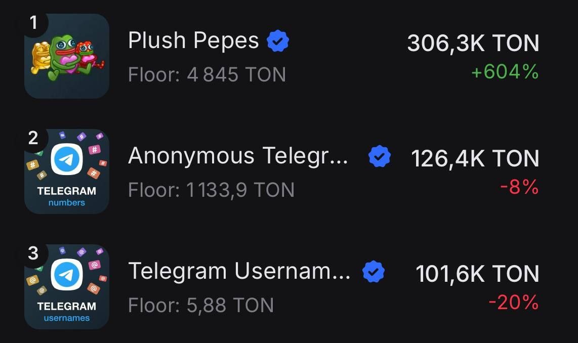 📈Plush Pepe обогнали анонимные номера и юзернеймы по торговому объему!