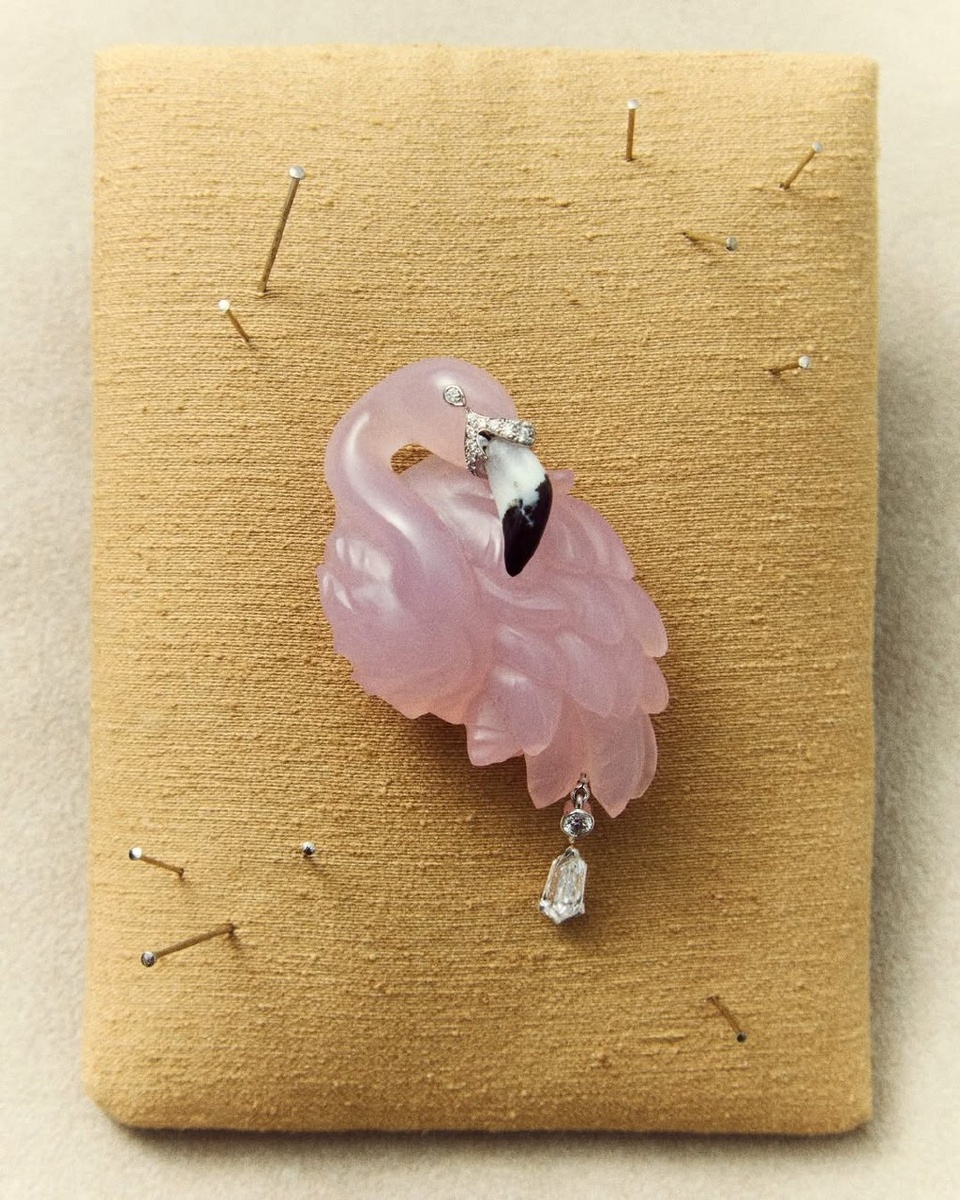 Для тех, кому хочется впустить в свою жизнь немного экзотики. Ювелирный дом Cartier снова выпустил украшение в виде фламинго. Впервые украшения с этой дивной птицей появились в работах бренда в 1940-м — тогда это были бриллиантовые броши. Новая интерпретация не менее эффектна: вырезанный из цельного розового кварца силуэт с агатовым клювом и россыпью тонко проработанных перьев, с которых свисает один-единственный бриллиант.