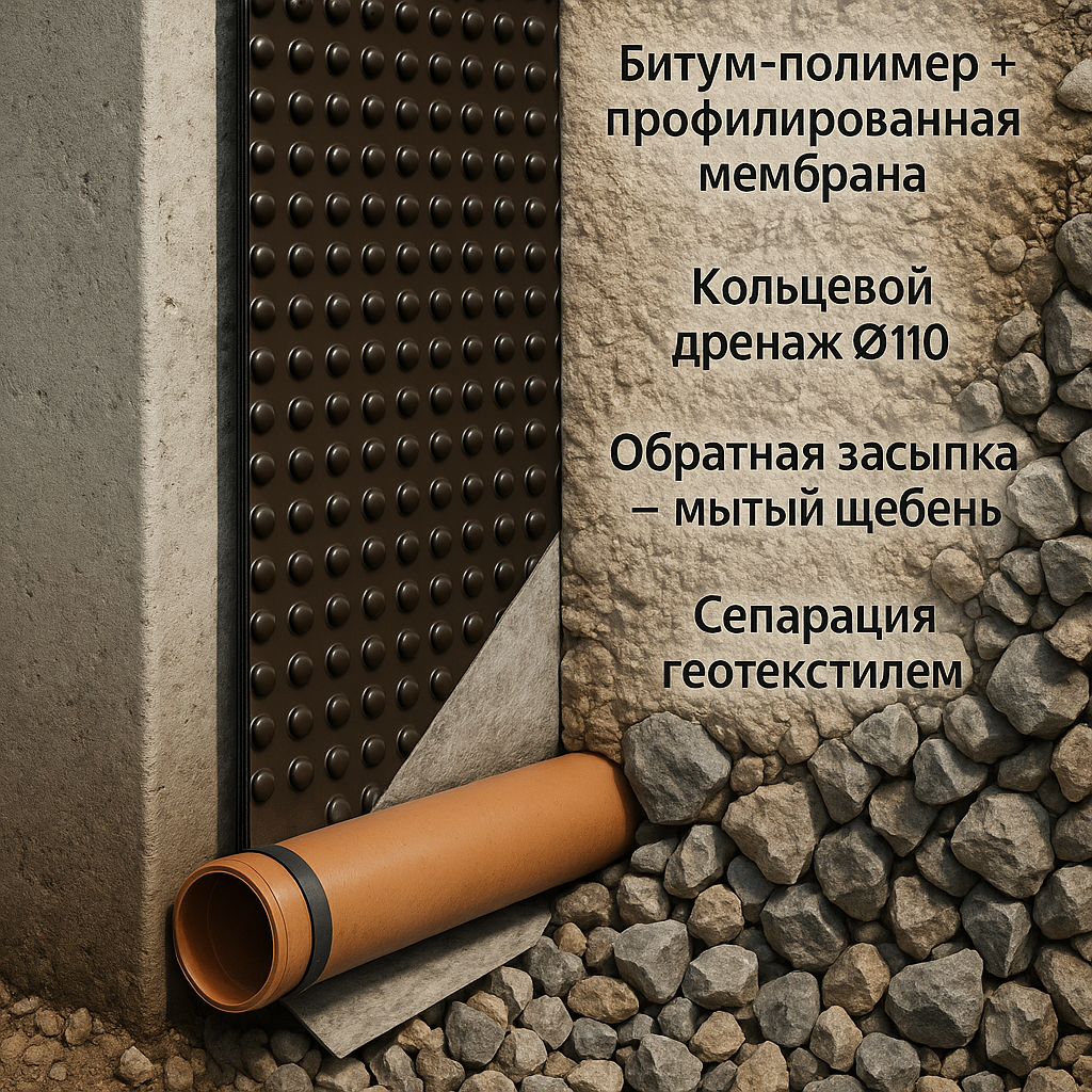 Честно и по-взрослому: подвал = метры + риски, плита = спокойный бюджет и эксплуатация. В 8 из 10 случаев выигрывает плита. Ниже — когда подвал действительно оправдан, а когда он «ест» деньги и нервы. Если участок со склоном и цоколь можно открыть окнами в откос — получается «дневной» полуподвал без вечной сырости. Если участок маленький, а хочется спортзал/мастерскую/кладовые — да, подвал спасает планировку. И ещё: когда есть шумная котельная/насосы/серверная — подвал вытаскивает акустику и чистоту интерьеров. Но всё это работает только с правильной гидроизоляцией и вентиляцией. Подвал — это не «ещё один этаж». Это: котлован, вывоз, бетон/армирование стен, наружная гидроизоляция, профилированная мембрана, утепление, кольцевой дренаж с колодцами, обратная засыпка мытым щебнем, лестница, вентиляция/осушение. В сумме — чаще +20–35% к «коробке» такого же дома на плите. У плиты — наоборот: меньше земляных, меньше «мокрых» рисков, понятная цена. Высокие грунтовые воды, глина, «чаша» на уча