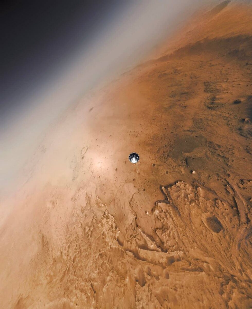 Потрясающее фото:«Прощальный взгляд на тепловой щит» Во время посадки на Марс в 2021 году, на высоте около 7 километров, марсоход «Персеверанс» осуществил отстрел своего теплового экрана. Этот 4.5-метровый щит, выполнив свою задачу по защите аппарата от нагрева в 1300°C при атмосферном спуске, был сброшен на сверхзвуковой скорости. Данный маневр был критически важен для раскрытия парашюта и активации навигационной системы, позволившей роверу, после 203 дней полета от Земли к Марсу, безопасно достичь поверхности в кратере Езеро. «Щукин и всё»