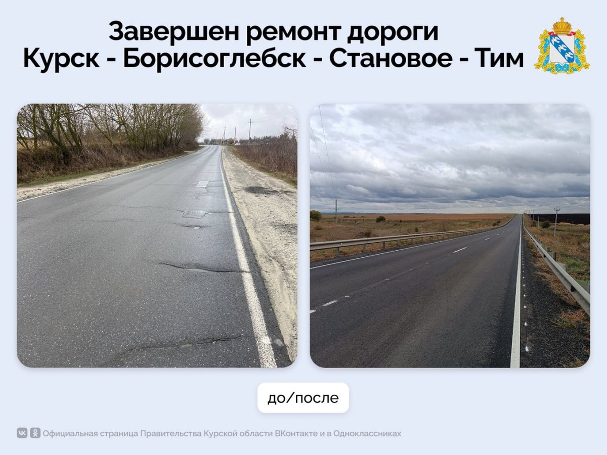 В Курской области отремонтировали еще одну дорогу В Тимском районе Курской области отремонтировали дорогу Курск — Борисоглебск — Становое — Тим. Протяженность трассы около 7,5 километров. Работы проводились по национальному проекту «Инфраструктура для жизни». Данная дорога значимая. Официальные власти сообщили, что дорога соединяет федеральную автомобильную трассу Р-298 Курск — Воронеж — Р-22 «Каспий» с административным центром района — поселком Тим. Кроме того, она проходит через село Становое, где находятся общеобразовательная школа и храм Георгия Победоносца, построенный в XIX веке.
