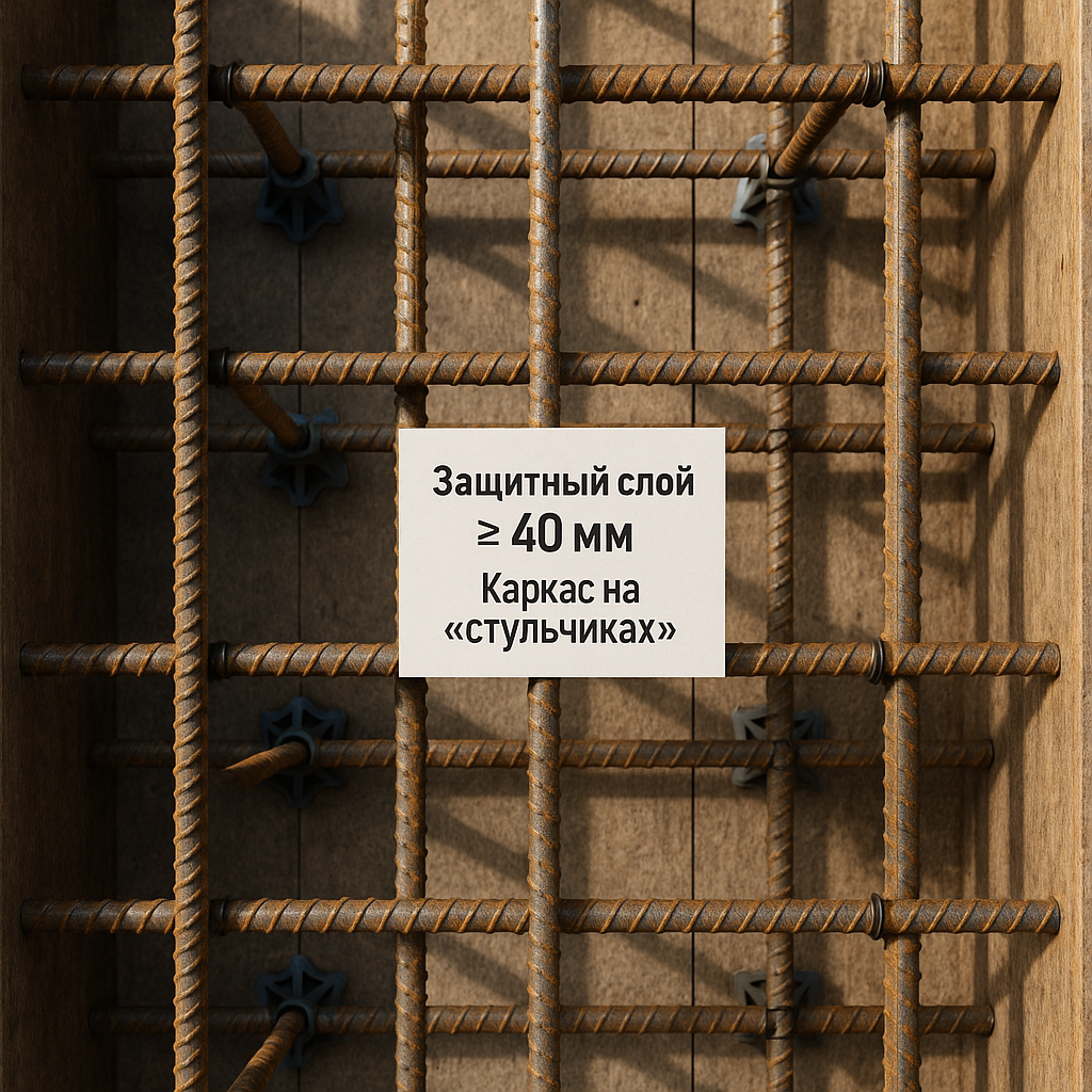 Как правильно: каркас на «стульчиках», защитный слой ≥ 40 мм, выпуск арматуры по проекту, фиксация хомутами.