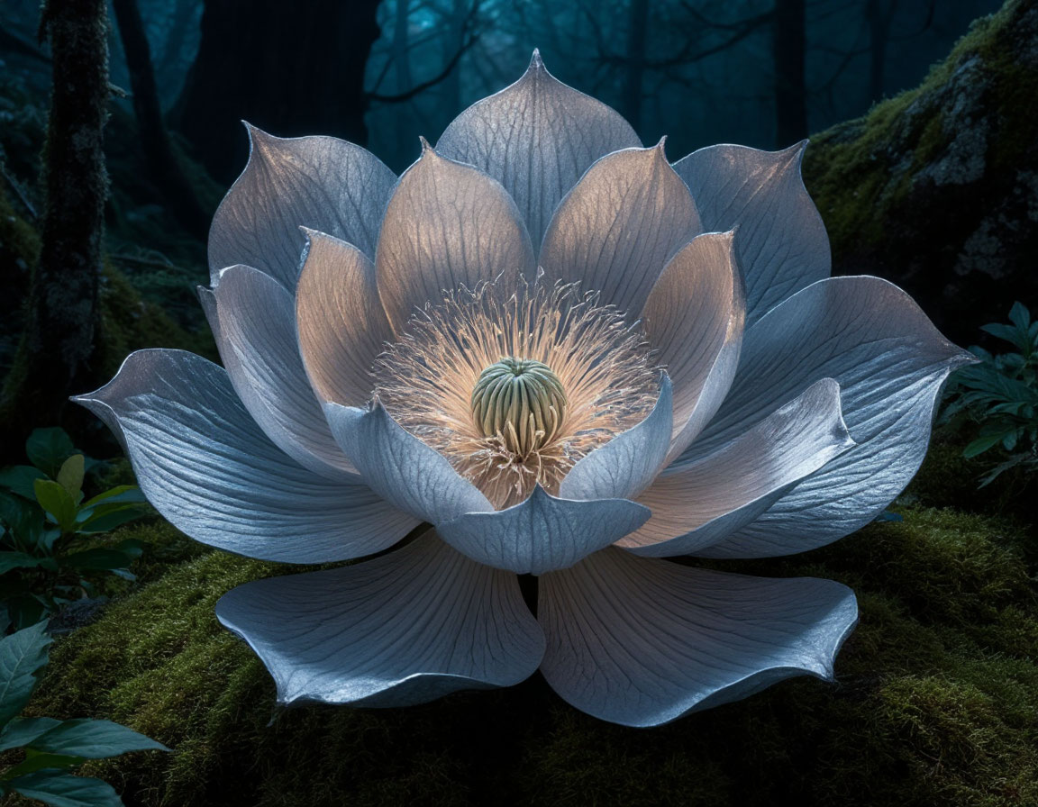 И тут Дуняша вскрикнула и остановилась как вкопанная. Прямо перед ними, в луче лунного света, стоял цветок. Он был огромным, размером с человеческую голову, и лепестки его были цвета расплавленного серебра. Они светились изнутри, отбрасывая призрачное сияние на окружающий мох. От него исходило тонкое, пьянящее благоухание, опьяняющее и дурманящее.