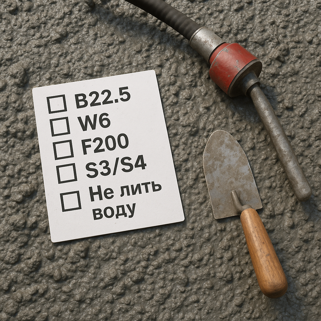 Вязка каркаса. По проекту: шаг, защитный слой ≥ 40 мм, «стульчики», перевязка. Не «как пойдёт», а по схеме. Марка и объём бетона. Никаких «долить воды в миксер». Класс B22.5 W6 F200, подвижность S3–S4, объём считают: V = L×W×h × 1,05–1,07.