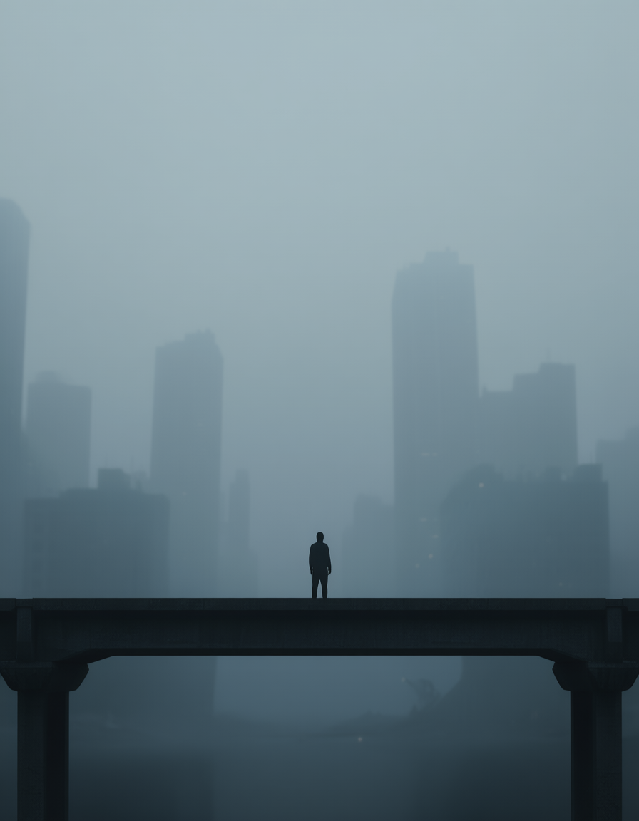 ✅ Узнаваемая цветовая палитра — например, синие тона для триллера, тёплые — для драмы Все промты созданы в кинематографическом стиле, без текста, с местом под название. Подходят для MidJourney, Шедеврума, DALL·E. Одинокая фигура стоит на краю пустого моста в тумане, силуэт чёткий, фон — размытые очертания города, холодная палитра с оттенками серо-голубого, кинематографическое освещение с контровым светом, композиция по правилу третей, пустое пространство сверху для текста, настроение — изоляция, выбор, тишина, б