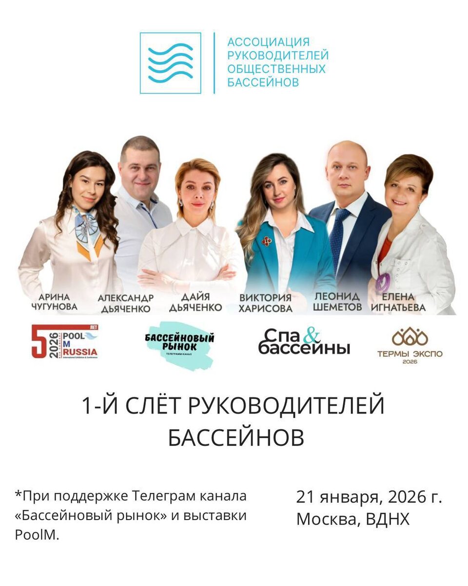 Информация для руководителей общественных бассейнов. Если вы хотите принять участие в 1-ом Слёте РОБ-ов, а также Бесплатно посетить выставку-конференцию “PoolM - Бассейны и Термы Экспо” 2026. Если вам нужно официальное приглашение для оформление командировки. Пожалуйста заполните форму по ссылке https://forms.yandex.ru/u/68dbd46fe010db03c523027e/ Или направьте заявку на эл почту : arobpool@yandex.ru ————————— 🌊 Ассоциация Руководителей Общественных Бассейнов при поддержке выставки "Pool М" и информационного Telegram-канала «Бассейновый рынок» приглашает на 1-й СЛЁТ РУКОВОДИТЕЛЕЙ БАССЕЙНОВ Руководителей, владельцев и управленцев общественных бассейнов. КОГДА: 21 ЯНВАРЯ 2026 ГДЕ: г. Москва, ВДНХ, павильон 57 (зал конференций) ДЛЯ РУКОВОДИТЕЛЕЙ БАССЕЙНОВ, КОТОРЫЕ ЦЕНЯТ СВОЕ ВРЕМЯ: если вам некогда слушать длинные презентации и вебинары о бассейнах-это мероприятие для вас Блиц-доколады по 15-30 мин на важные темы + готовые чек-листы и шаблоны документов по каждой теме СУХАЯ ВЫ