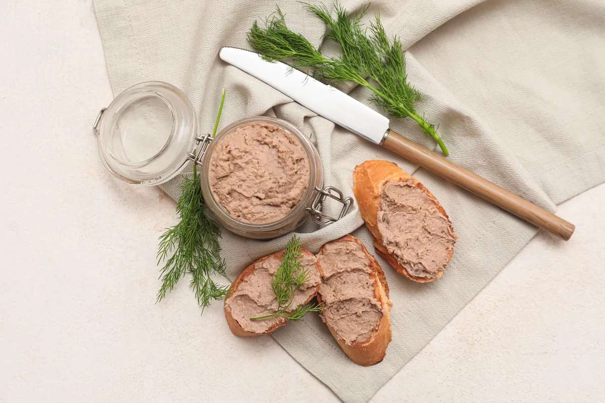 - Нарежьте багет, подсушите в духовке, намажьте паштет, украсьте укропом.