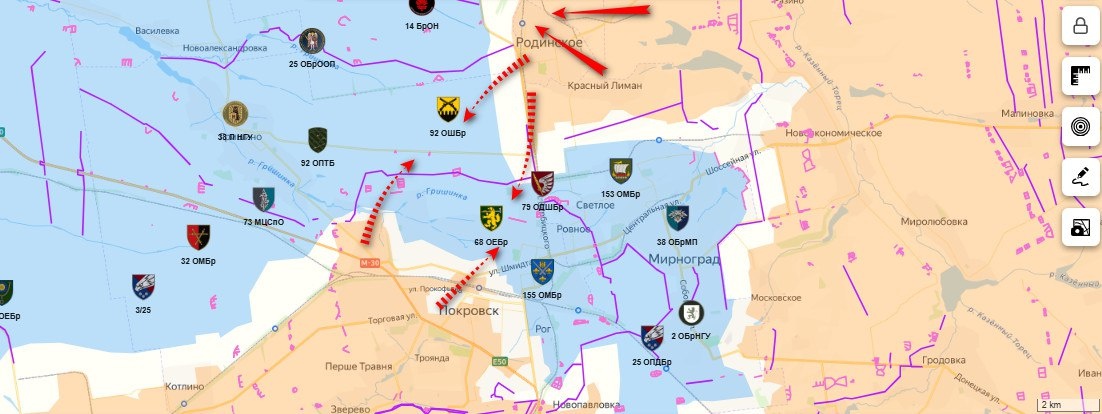 ❗️🗺Российские штурмовики из 9-й МСБр прорвались в застройку Родинского и установили физический контроль над населённым пунктм, прикрыв