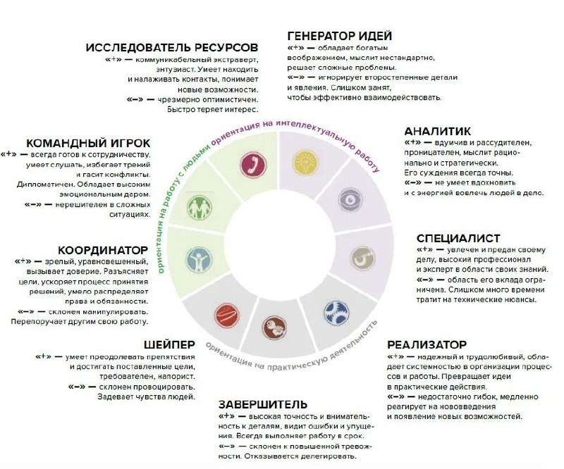 Друзья, как сформировать успешную команду? Команда — это собрание самых умных и ярких индивидуальностей ИЛИ грамотный набор взаимодополняющих ролей, где недостатки одних компенсируются достоинствами других? М.Белбин провёл масштабное исследование... разный успех команд зависит на 60-80% от их поведенческих ролей. Суть: 1. Нет плохих или хороших ролей. Есть уместные и неуместные в конкретной ситуации. 2. Каждый человек играет 2-3 роли. 3. Сильная сторона — это обратная сторона слабости. 4. Команда из одних только лидеров/исполнителей обречена на провал. Модель: 1 МЫСЛИТЕЛИ Эти люди обеспечивают команду интеллектуальным капиталом. 1. Генератор идей Профиль: творческий, нестандартно мыслящий, интроверт. Источник инновационных идей и решений. Сила: воображение, интеллект, креативность. Слабости: "витает в облаках", плохо коммуницирует, игнорирует практические детали. Ключевой вклад: "а что, если сделать вот так...?" 2. Аналитик Профиль: рассудительный, проницательный, стр