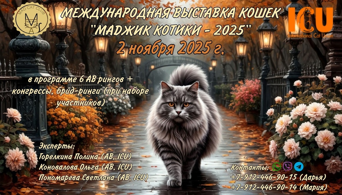⏰ 2 ноя (7д) 🏛 #Ижевск #Россия #Выставка 😽 Выставка кошек и котов: MADЖИК КОТИКИ-2025 🏆 Клуб любителей кошек "Mad Cat Club" Контакты организаторов здесь: 🌐 https://www.sunny-cat.ru/vystavki-koshek.php?mesto=125-izhevsk В программе: 🔥 6 AB рингов в 1 день (возможность закрыть два титула) 💥 + дополнительные ринги (конгрессы, брид-ринги - при наборе участников) 🧑 👨 Эксперты: 🔹 Горелкина Полина (AB, ICU), г. Москва 🔹 Коновалова Ольга (AB, ICU), г. Москва 🔹 Пономарева Светлана (AB, ICU), г. Москва
