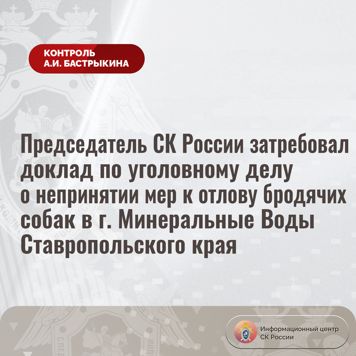 Председатель СК России затребовал доклад по уголовному делу о непринятии мер к отлову бродячих собак в г. Минеральные Воды Ставропольского края В социальной сети сообщается о ненадлежащей организации отлова безнадзорных собак в городе Минеральные Воды Ставропольского края. В населенном пункте обитает большое количество животных, которые систематически проявляют агрессию к прохожим. В октябре текущего года стая собак напала на 14-летнюю девочку, укусив ее за ногу. Местные жители опасаются за свою жизнь и здоровье, однако мер реагирования не принимается. В СУ СК России по Ставропольскому краю по данному факту возбуждено уголовное дело. Председатель Следственного комитета Российской Федерации Александр Иванович Бастрыкин затребовал у и.о. руководителя СУ СК России по Ставропольскому краю Олега Евгеньевича Сидорова доклад о ходе и результатах расследования уголовного дела. Исполнение поручения поставлено на контроль в центральном аппарате ведомства. #СледственныйКомитет #СКРоссии #СКР #ИЦС