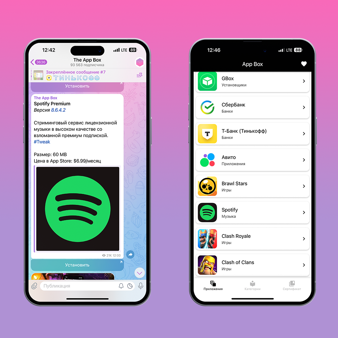 В данной статье мы покажем два способа по установке приложений и игр из канала The App Box и приложения App Box. Вы также можете купить личный сертификат разработчика, для того, чтобы установленные приложения работали без вылетов ровно год! 2. Нажимаем на кнопку "Установить" и после этого запускаем бота для установки с названием App Box. 3. Переходим по прямой ссылке с названием "Установить", и нажимаем здесь на кнопку "Установить" еще раз. 4. Нажимаем на кнопку "Download". 5. После чего нажимаем сначала "Открыть", а затем "Установить". 6. После установки переходим в Настройки, далее раздел Основные, листаем в самый низ и открываем пункт VPN и управление устройством. 7. Ищем пункт "Ненадежный" и нажимаем на кнопку "Доверять". Суть этого способа заключается в том, чтобы самостоятельно сгенерировать прямую ссылку для установки приложения. 2. Добавляем ваш личный сертификат в бота, или же при наличии выбираем бесплатный сертификат, нажимая на кнопку "Free Cert". 3. Бот попросит нас присла