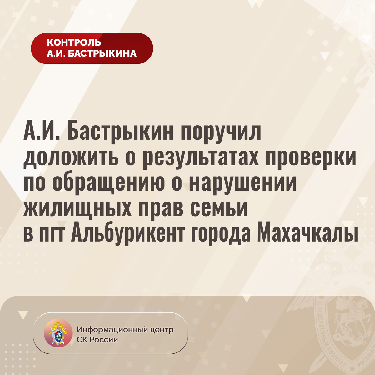 А.И. Бастрыкин поручил доложить о результатах проверки по обращению о нарушении жилищных прав семьи в пгт Альбурикент