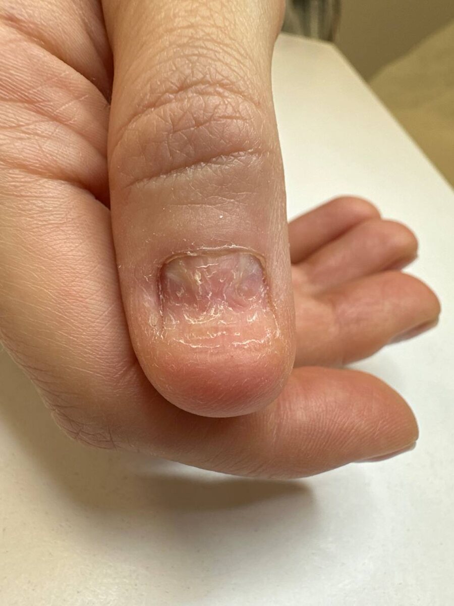 1. Гиперкератоз ногтевого ложа. Кожа, оставшаяся без защиты, начинает утолщаться и грубеть (ороговевать), пытаясь компенсировать отсутствие ногтя. Это естественная защитная реакция, но она создает проблемы для будущего отрастания здорового ногтя.