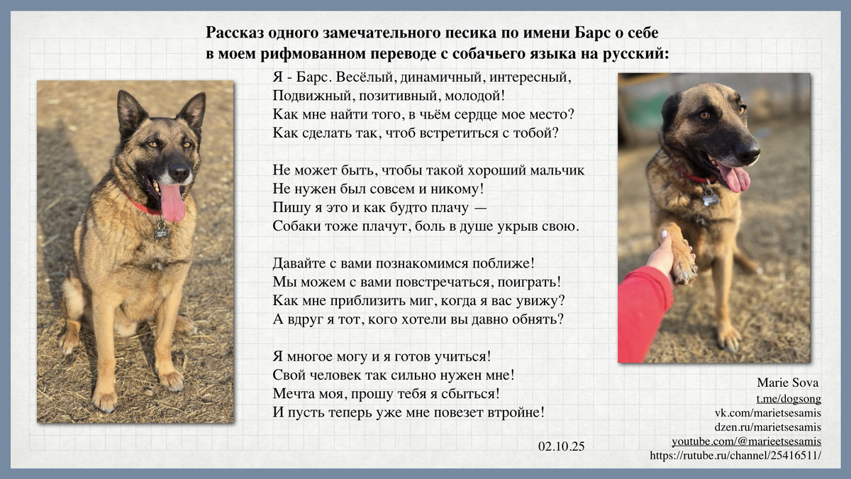 Рассказ одного замечательного песика по имени Барс о себе в моем рифмованном переводе с собачьего языка на русский: