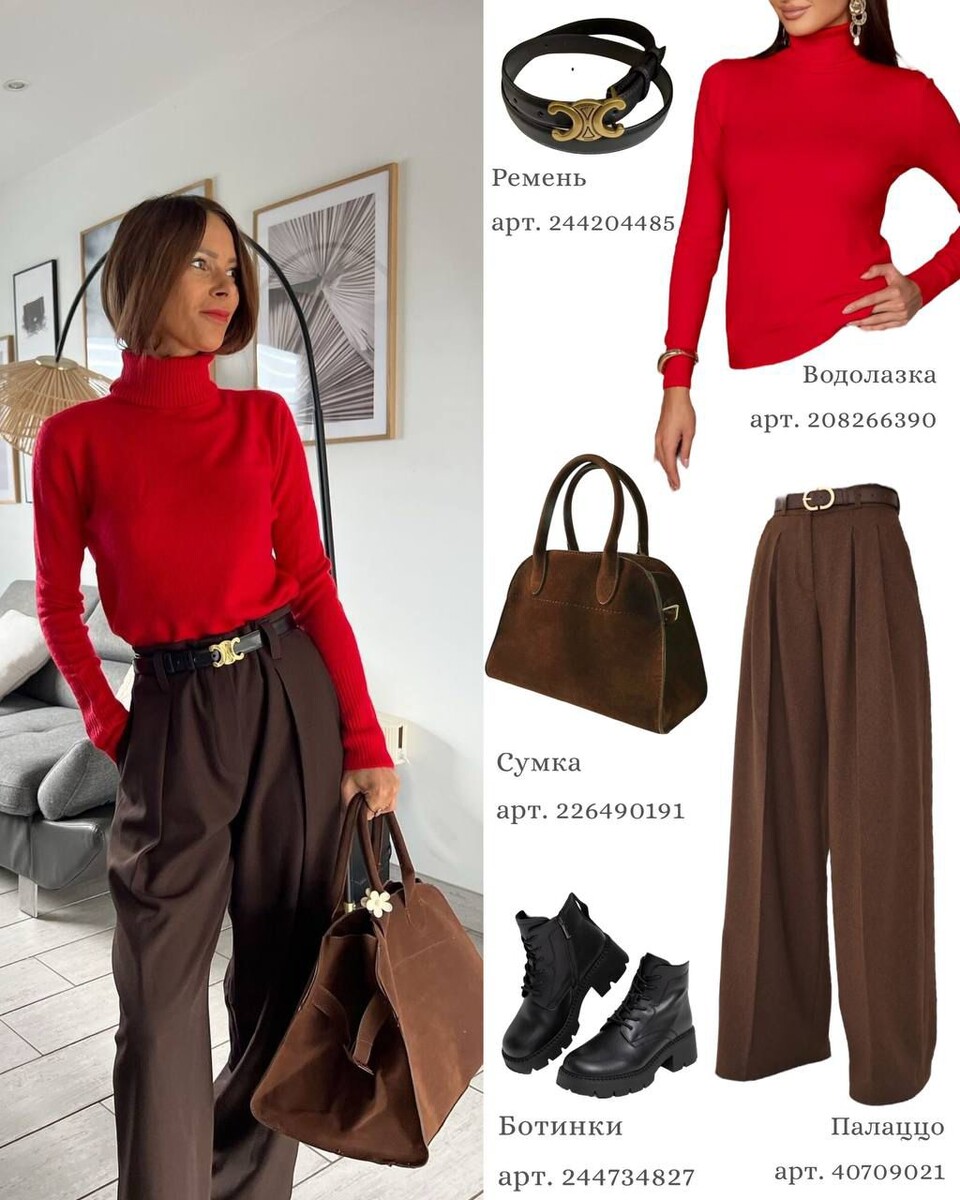 Красная водолазка, брюки цвета какао — сочетание, которое невозможно испортить.