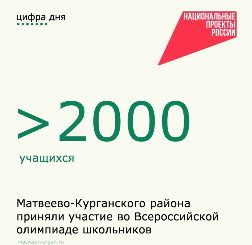 Национальный проект «Молодёжь и дети» создает условия для всестороннего развития школьников, включая возможность участия во Всероссийской олимпиаде школьников. Это масштабное интеллектуальное соревнование охватывает 24 учебных предмета и помогает выявлять одаренных детей для дальнейшей поддержки и развития. Всероссийская олимпиада школьников — главная олимпиада России, в которой могут участвовать школьники 4-11 классов. В 2025-2026 учебном году стартовал новый цикл олимпиады. В Матвеево-Курганском районе более 2000 ребят приняли участие в школьном этапе, а ученики 7-11 классов, показавшие хорошие результаты, пройдут на муниципальный этап.