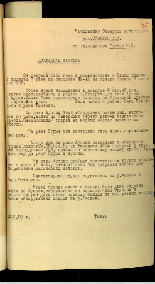 Пожалуй, самым непонятным в деле гибели группы Дятлова остается вопрос обнаружения палатки. Судя по отчетам и радиограммам место, где её обнаружили, исследовалось и с воздуха, и с земли несколько дней. Пока вдруг не нашли палатку якобы засыпанную снегом. При этом у нас нет фотографий засыпанной снегом палатки. Поэтому остается только верить показаниям первых её обнаруживших. В том плане что она действительно была завалена. Но в любом случае часть её выглядывало из-под снега иначе никак бы не получилось заметить палатку даже в бинокль. Этот район облетали на самолете и есть докладная записка Титова. Из неё четко видно, что пролетали по восточному склону Уральского хребта. Осматривали район горы Отортен и всю реку Ауспию. Даже обнаружили следы от лыж. Но палатку не заметили. Группа Слобцова проходила недалеко от места установки палатки. Но не заметила. И только когда вдруг решили вернуться к Отортену, увидели палатку. При этом после того, как они ушли от горы Отортен, то на эту гору тут