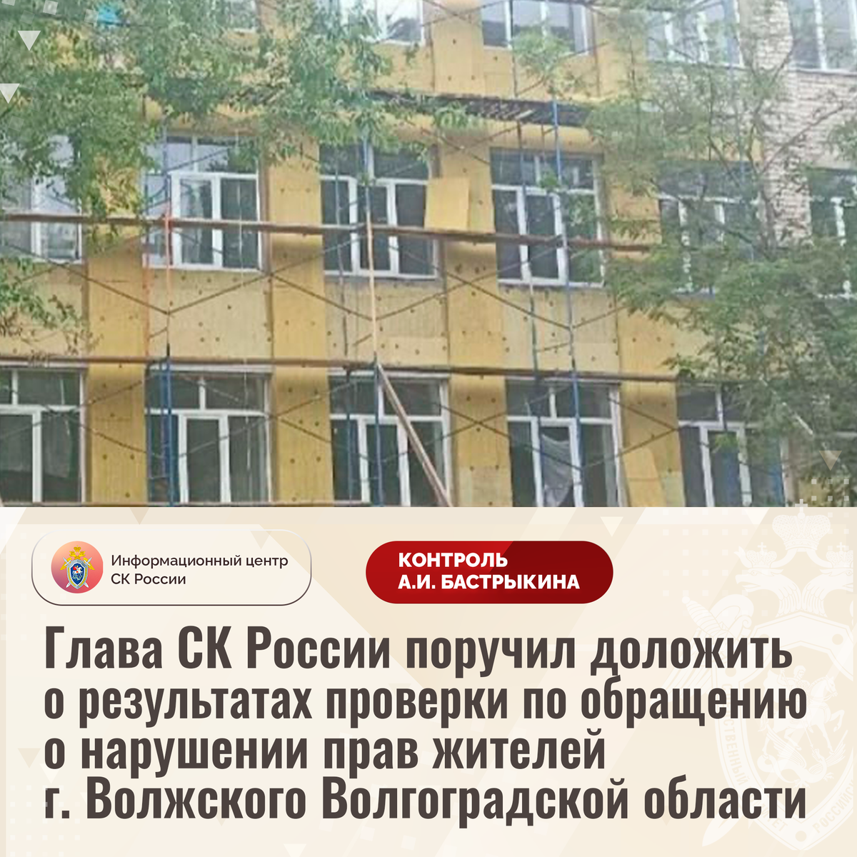 Глава СК России поручил доложить о результатах проверки по обращению о нарушении прав жителей г. Волжского Волгоградской области К Председателю СК России А.И. Бастрыкину через его приёмную «ВКонтакте» обратилась жительница города Волжского Волгоградской области по вопросу нарушения прав несовершеннолетних. В январе прошлого года в рамках реализации программы в здании школы начат капитальный ремонт, окончание которого планировалось до марта текущего года. Однако до настоящего времени работы не завершены, срок исполнения контракта постоянно продлевается. В связи с этим более года дети лишены возможности посещать учебное заведение, расположенное вблизи их места жительства. Многочисленные обращения обеспокоенных родителей в различные инстанции результатов не принесли. Ранее указанная ситуация освещалась в СМИ. В СУ СК России по Волгоградской области по поступившему обращению организована процессуальная проверка. Председатель Следственного комитета Российской Федерации Александр Иванович Ба