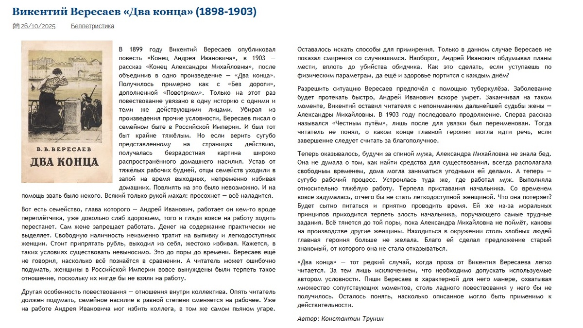 Викентий Вересаев «Два конца» Критика