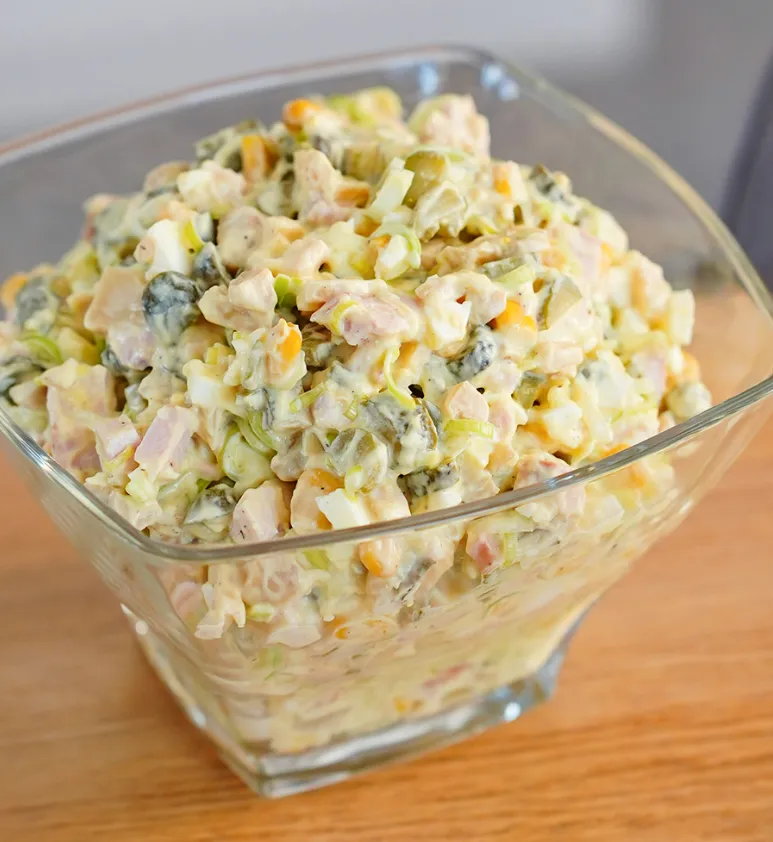 Почему-то в холодное время салаты в праздничном меню становятся чуть ли не основой меню и главным блюдом. Конечно, многие ограничиваются оливье с шубой, но... если они вам уже надоели, то мы продолжим знакомить вас с новенькими салатами для праздников, что сможет приготовить любой. Даже бедный студент или не очень богатый пенсионер. Салатов много не бывает! 300 гр. ветчины или буженины (можно любые мясные нарезки-копчености) 1/2 лука-порея (можно заменить на белый салатный сладкий лук) 10 маринованных грибов (например, целых маринованных шампиньонов) 1 маленькая банка консервированной кукурузы 4 соленых огурца 5 вареных яиц 4 столовые ложки натурального йогурта или сметаны 2 столовые ложки майонеза 2 зубчика чеснока соль перец 1. Разрежьте лук-порей на половинки и залейте его кипятком в дуршлаге, опущенном в миску. Если готовите из салатного белого лука, то измельчите его полукольцами и также ошпарьте кипятком. 2. Яйца сварите вкрутую, очистите и нарежьте кубиками. 3. Также нарежьте ку