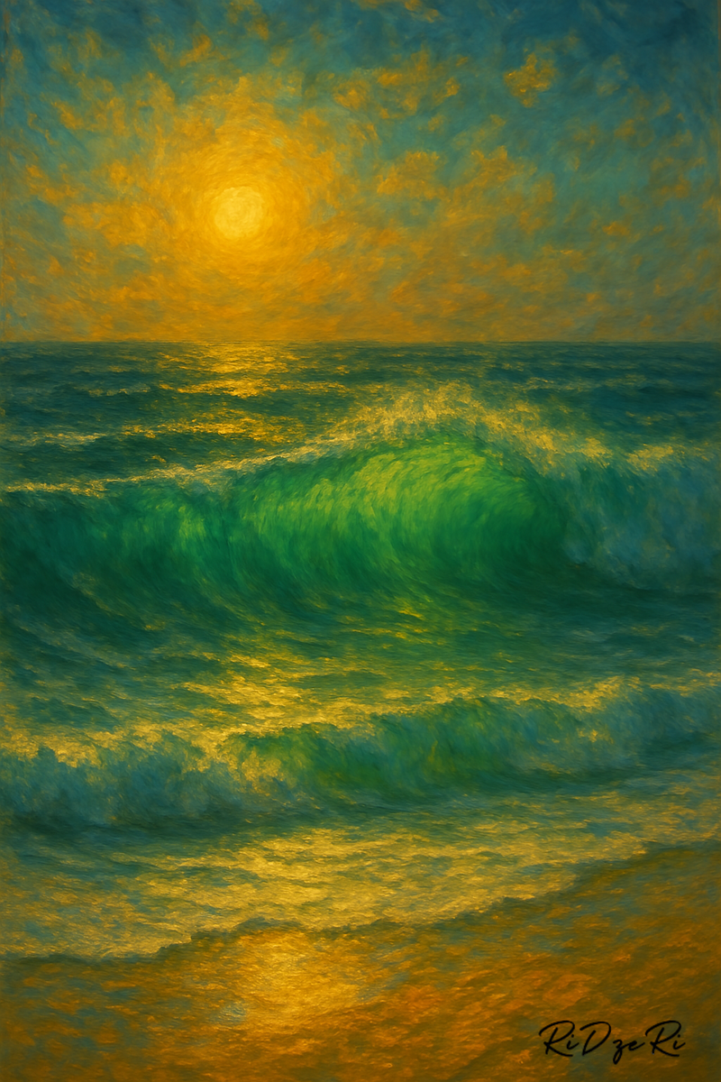 "Океан Света RiDzeRi" — это произведение, наполненное энергией пробуждения, движения и глубинной трансформации. В центре композиции — волна, пронизанная бирюзовым светом восходящего солнца, несущая силу стихий и импульс нового начала. Тёплые оттенки неба, сияние воды и живые мазки создают ощущение перехода между мирами.