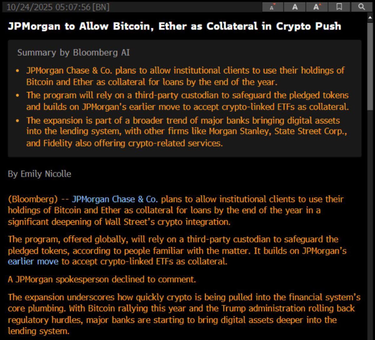 Когда даже JP Morgan принимает биткоин в залог — это сигнал. Bloomberg подтвердил: к концу года JP Morgan Chase позволит институциональным клиентам использовать биткоин и эфир как обеспечение по кредитам. То, что начиналось как эксперимент с ETF, теперь превращается в полноценную банковскую инфраструктуру. Программа будет работать через кастодианов третьей стороны — чтобы обеспечить хранение и юридическую чистоту активов. Но суть не в этом. Суть в том, что крупнейший банк США признал цифровые активы залогом. Это значит две вещи: 1. Финансовая система ищет новое обеспечение. Когда даже Treasuries теряют роль «безрискового актива», банки вынуждены расширять понятие коллатераля. Кстати ☝️ последний актив, который стали принимать в качестве залога, были как раз treasuries. 2. Крипта становится частью долгового контурa. Теперь биткоин — не просто актив для спекуляций, а ликвидный инструмент кредитного обеспечения. Ирония: JP Morgan — тот самый банк, глава которого ещё недавно называл