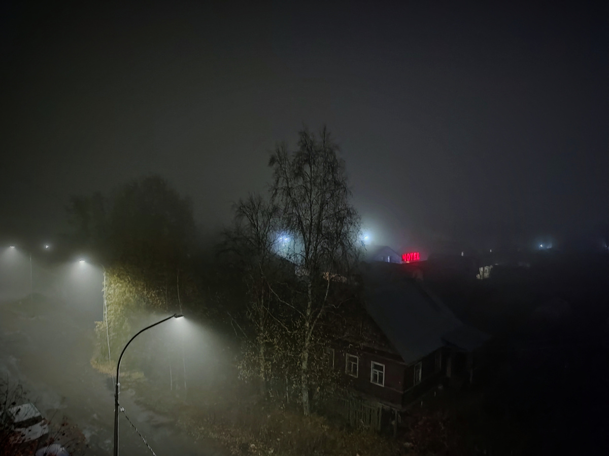 Воскресенье. 26.10.25. Вчерашний туман никак не хочет рассеиваться. Ночью, выглянув в окно, можно было подумать, что это декорации к фильму про маньяков)) На улице настолько тепло, что накидываю куртку прямо на футболку и отлично. Воздух сырой, но теплый. Пахнет опавшей листвой. Яблоня стоит ещё вся зеленая. На фото не видно, но на макушке краснеют два больших яблока. Пару недель смотрю, никто на них так и не посягнул. Мартышечка вечером угнездилась в кресле-мешке. Шуршала-шуршала и устроилась. И такая она уютная в нём) Провалилась в ямку и лежит. Вяжу, а она подсматривает) Надо бы завязывать с вязанием до глубокой ночи. Но как себя остановить? Ещё петельку, ещё рядочек и всё, час ночи. Ночью встречаемся с Сардельковной на кухне. Я на минутку что-нибудь... 🤭 а на меня уже смотрят зеленые глаза, мол, без меня хотела похомячить?) Каждый раз это так смешно. Вяжу платье. Полухлопок, цвет "тыква". Часть осеннего наряда. Может вы помните, в Мурманске Мартыша постоянно охотилась за пряжей, к