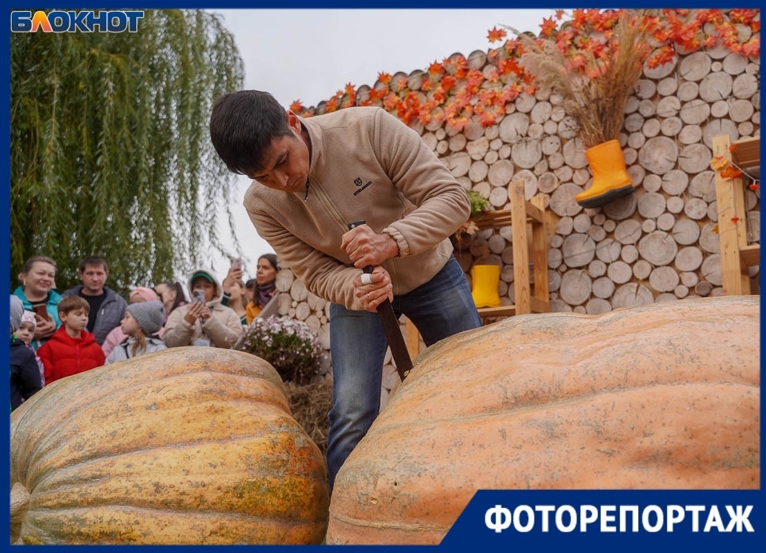 Волгоградский фермер вырастил гигантские тыквы, вес одной из которых перевалил отметку в 300 килограмм. "Блокноту" удалось запечатлеть гигантскую оранжевую красавицу. Показываем яркие кадры из Центрального парка культуры и отдыха. В ЦПКиО сегодня, 26 октября, посетителей парка накормили символом осени – волгоградцам раздали почти 600 килограмм тыквы. Гостям удалось попробовать на вкус плоды трудов фермера из Среднеахтубинского района. Он установил рекорд, вырастив тыквы весом 243 и 323 килограмма. Гигантские тыквы из маленьких семян сорта Atlantic giant удалось получить Юрию Яковлеву. По словам фермера, овощи такого прихотливого сорта было вырастить нелегко: приходилось прятать плоды от попадания прямых солнечных лучей и обдувать их вентилятором во время жаркой погоды. Посетители парка с восхищением и удивлением наблюдали за тыквами гигантского размера, а также делали на память фото с ними. Люди возле оранжевых красавец выглядели совсем маленькими. Несмотря на крупный размер, тыквы оче