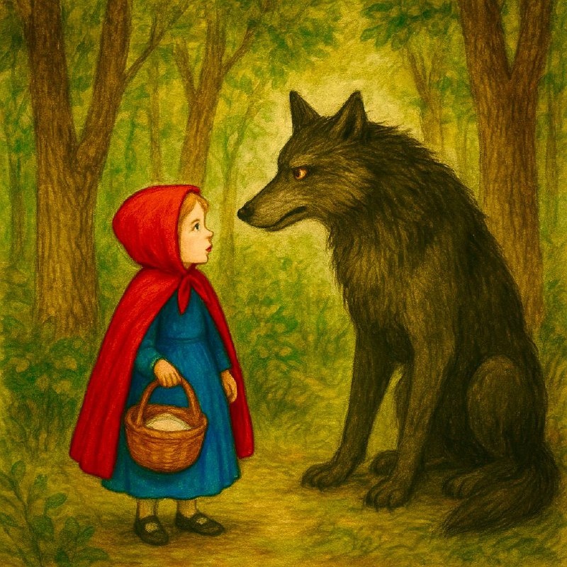 Девочка идёт через лес к бабушке. Волк её обманывает, съедает бабушку, а потом и внученьку. В некоторых версиях на этом конец. 🪶Версия Перро (1697): спасения нет, сказка заканчивается прямой моралью: Милые девушки, не разговаривайте с незнакомцами. 🪶Версия Братьев Гримм (1857): охотник спасает бабушку и внучку. 📚 Как понимать сказку? Владимир Пропп в «Морфологии волшебной сказки» определяет чёткую структуру: 📎уход героя, 📎нарушение запрета, 📎беда, 📎спасение. Красная Шапочка нарушает запрет матери (сходит с тропинки) и попадает в беду. Она образ ребенка на пороге взросления. Вы обратили внимание на цвет шапочки? Почему именно красный? Красный цвет в сказке в XX веке стали трактовать как символ перехода во взрослость: опасность, взросление — эта интерпретация появилась в XX веке у культурологов и психоаналитиков, таких как Беттельхейм, например. Волк — хищник и обманщик, но он ещё и символ хаоса и опасности внешнего мира. Таким образом, это история инициации: перехода от доверч