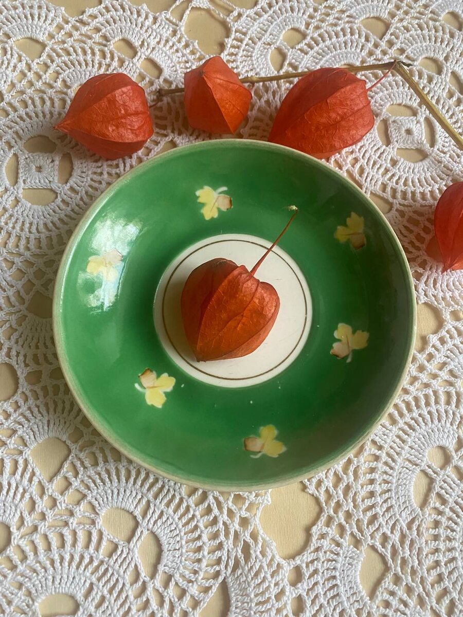 Первое блюдце фарфорового завода «Пролетарий». Зелёное крытьё и осенние кленовые листья. Простое, душевное, да ещё и бабушкино. Давно ищу ему пару.