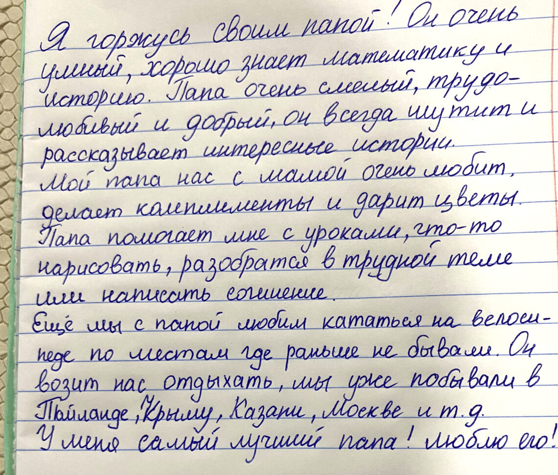 Моего папу зовут Антон. Наш папа – человек с золотыми руками. Он умеет делать ремонт, починить сломанные вещи, а еще он готовит самый вкусный в мире борщ! Папа очень трудолюбивый человек. Он работает на нижегородском заводе НИТЕЛ, и я горжусь его достижениями. Но самое главное в папе – это его большое и доброе сердце. В этом году на День Победы с нами произошел случай, о котором хотелось бы рассказать. В этот Великий праздник мы всей семьей отправились на площадь Героев. Мы с мамой и младшей сестренкой шли первыми, а папа немного задержался со сборами, и вышел из дома позднее, пообещав нас догнать. Мы уже ждали автобус на остановке, а его всё не было. У мамы зазвонил телефон, и в трубке раздался голос папы: «Езжайте без меня, у меня появилось срочное дело, скоро буду». Мы уехали без него. Всю дорогу я думала, что же случилось…Что заставило папу так задержаться… Конечно, я немного расстроилась. Спустя час, когда мы были уже на площади, вернулся наш папа и рассказал историю, которая произошла с ним. Оказалось, что когда папа спешил к нам на остановку, на улице его остановила совершенно незнакомая женщина с просьбой помочь. Она одна воспитывает ребенка-инвалида. В этот день у женщины прихватило спину, и ей нужно было помочь пересадить дочку с кровати на инвалидное кресло. Женщина вышла на улицу в надежде найти помощь! И нашла! Папа, не раздумывая, согласился. У меня было огромное чувство гордости за него! Мой папа – настоящий мужчина. Он сильный, смелый и надежный. Я люблю своего папу всем сердцем и хочу, чтобы он знал, как много значит для нас.